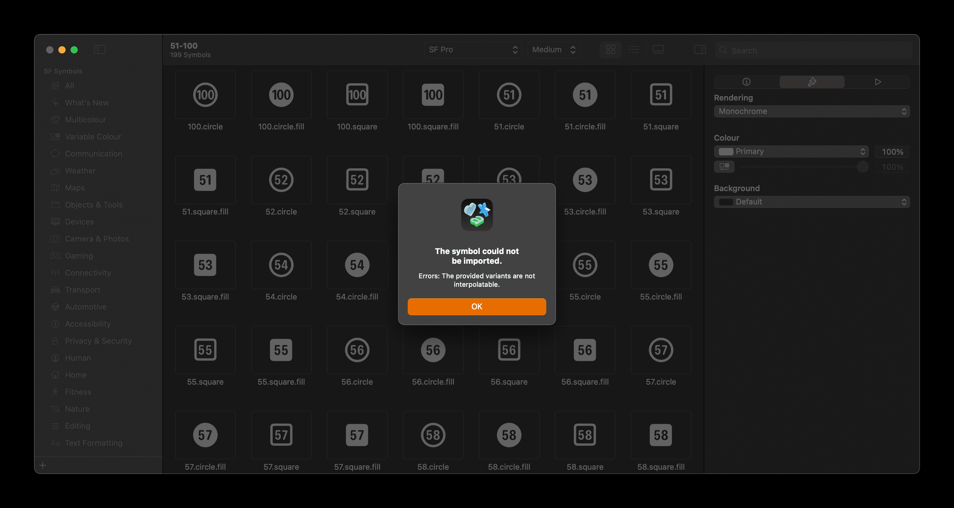 More often than I would like I hit the The provided variants are not interpolatable error when trying to import a saved SVG from Illustrator into the SF Symbols app.