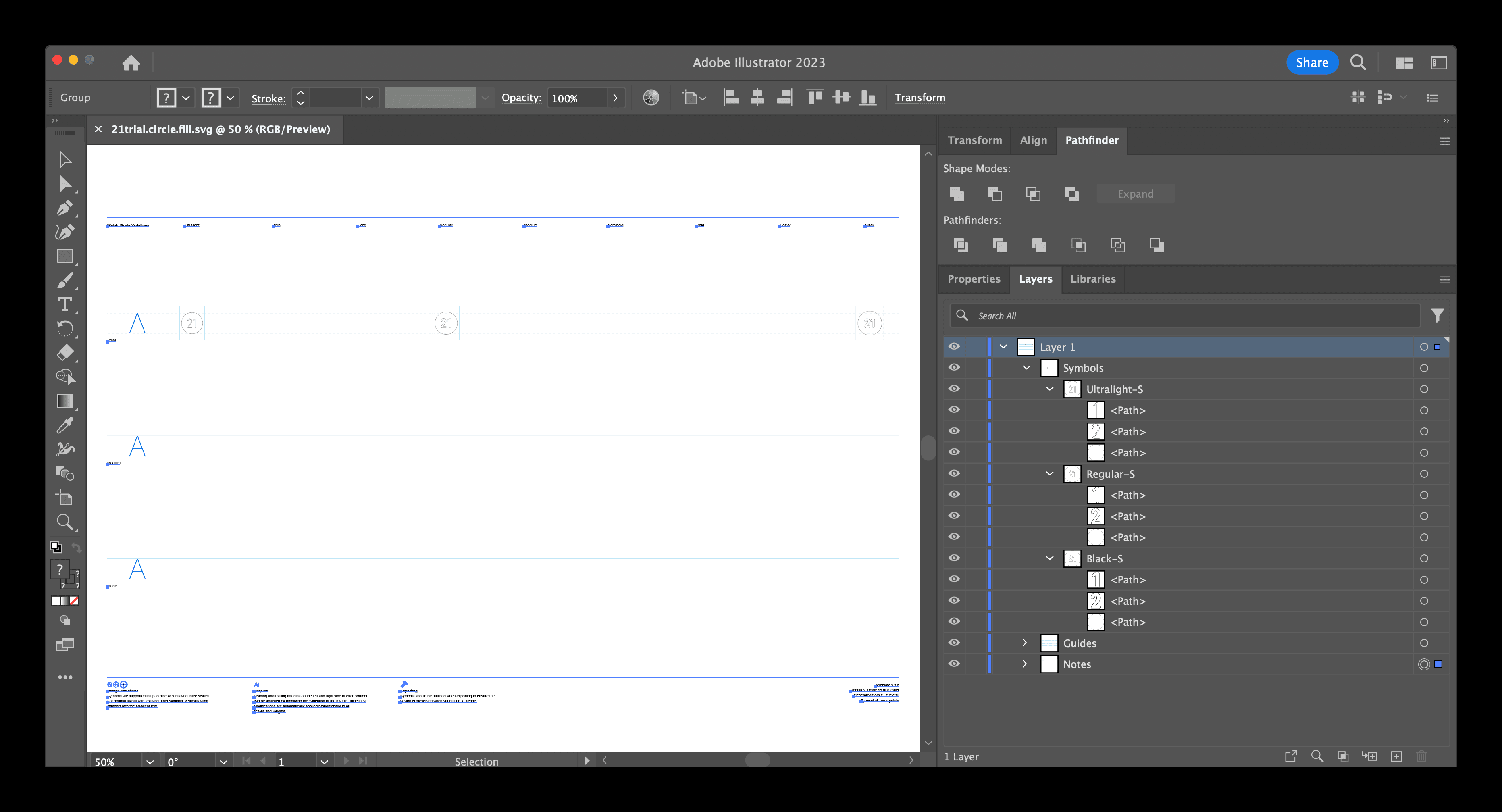 Open the resulting SVG template in Adobe Illustrator, and for each of the symbol variants (Ultralight-S, Regular-S and Black-S) expand the