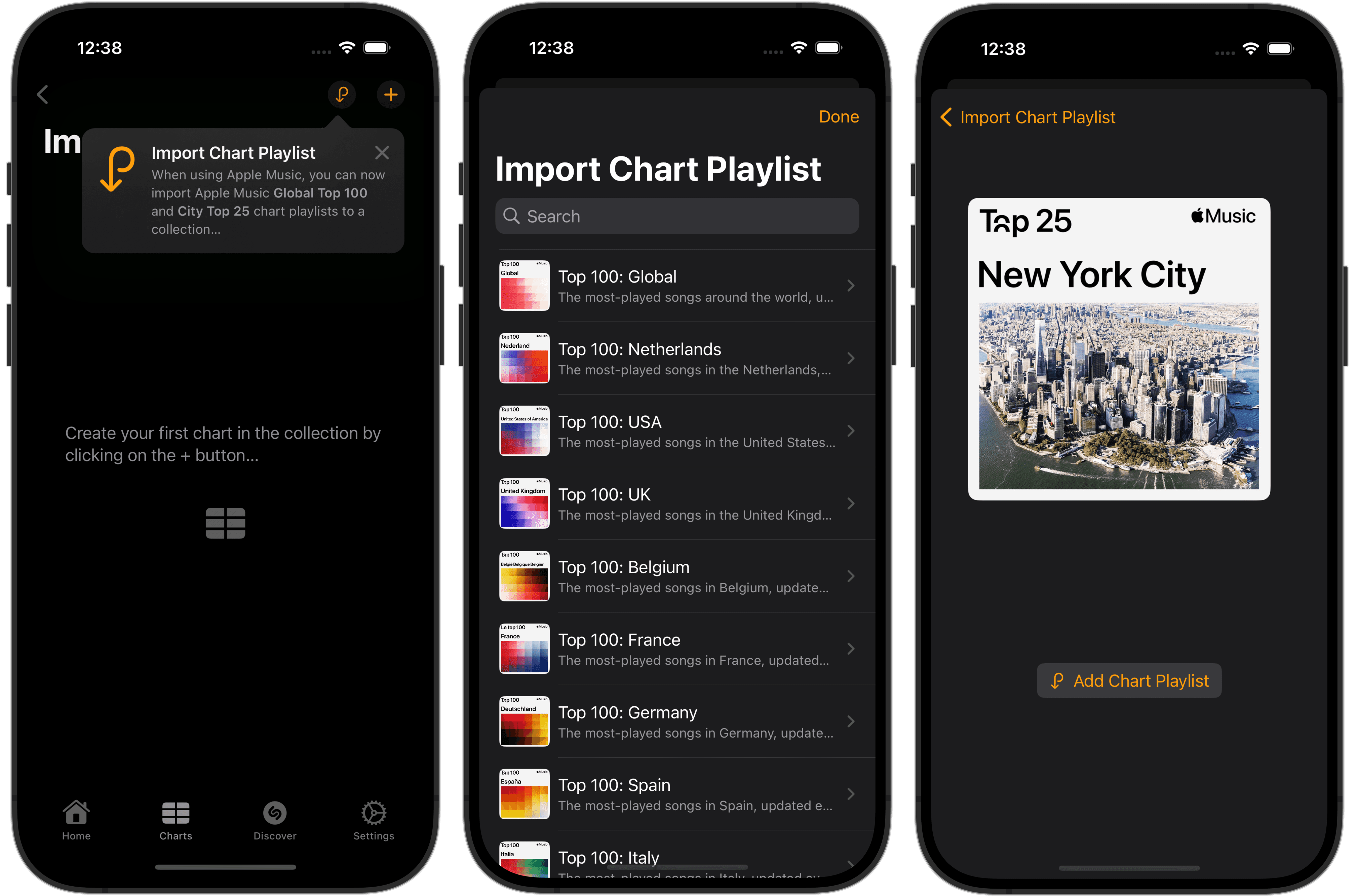 If you are using Apple Music as the music service in the app, and you want to keep track of these country and city charts, you can now import Apple Music chart playlists (like Top 100 and City Top 25) into a collection. Just create a collection to store a country's or city's chart playlists and start importing the chart playlist for that country or city on a daily (or regular) schedule.