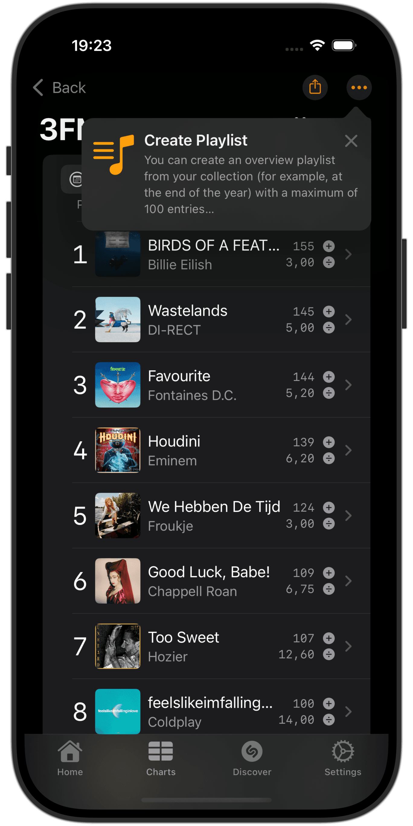 With the latest update, you can now also create a playlist from that overview in your selected music service. Note that the playlist only works with tracks (as albums are not supported as playlist entries) and is limited to a max of 100 entries. Also be aware that it can take some minutes for the playlist to be fully available in your music service, but once completed you can comfortably listen to all your favourite tracks from that single playlist. And obviously in reverse ranking order to ensure the playlist builds up to the best tracks.