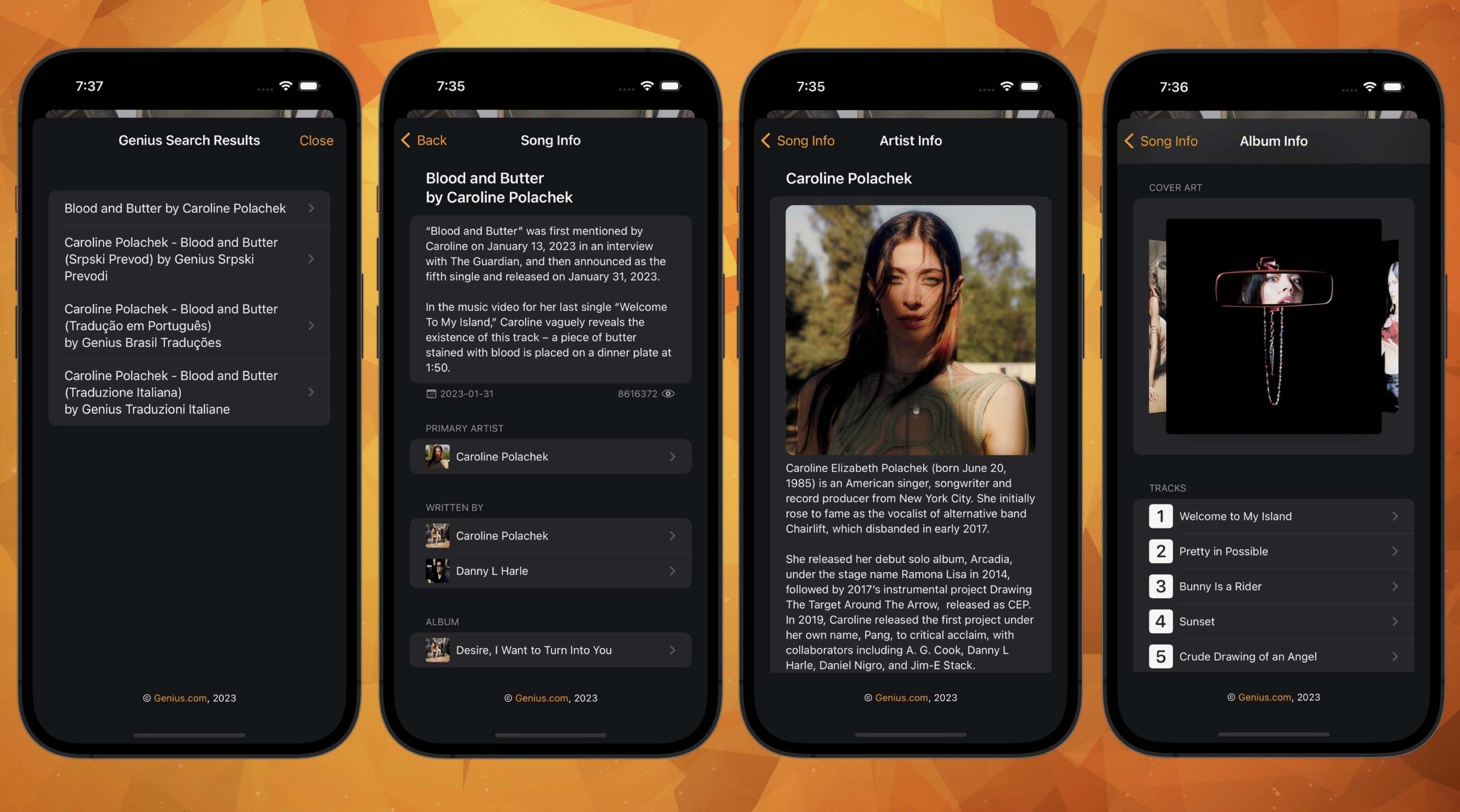 The cool thing is that you can almost lose yourself in all the possible navigation options from every information sheet offered through the Genius integration. From song to album to another song to artist. You want to know who plays bagpipes on Caroline Polacheck's Blood and Butter? We got you covered.
