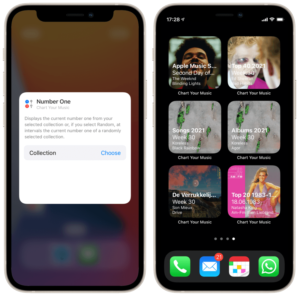 By default, the Number One widget will display at intervals a number 1 position from a random collection, always surprising you when opening the screen the widget is placed on. But you can configure a specific collection for each widget you add by long pressing the widget and tap on Choose to pick a specific collection. So you can build a screen with an overview of Number One widgets for all your collections…