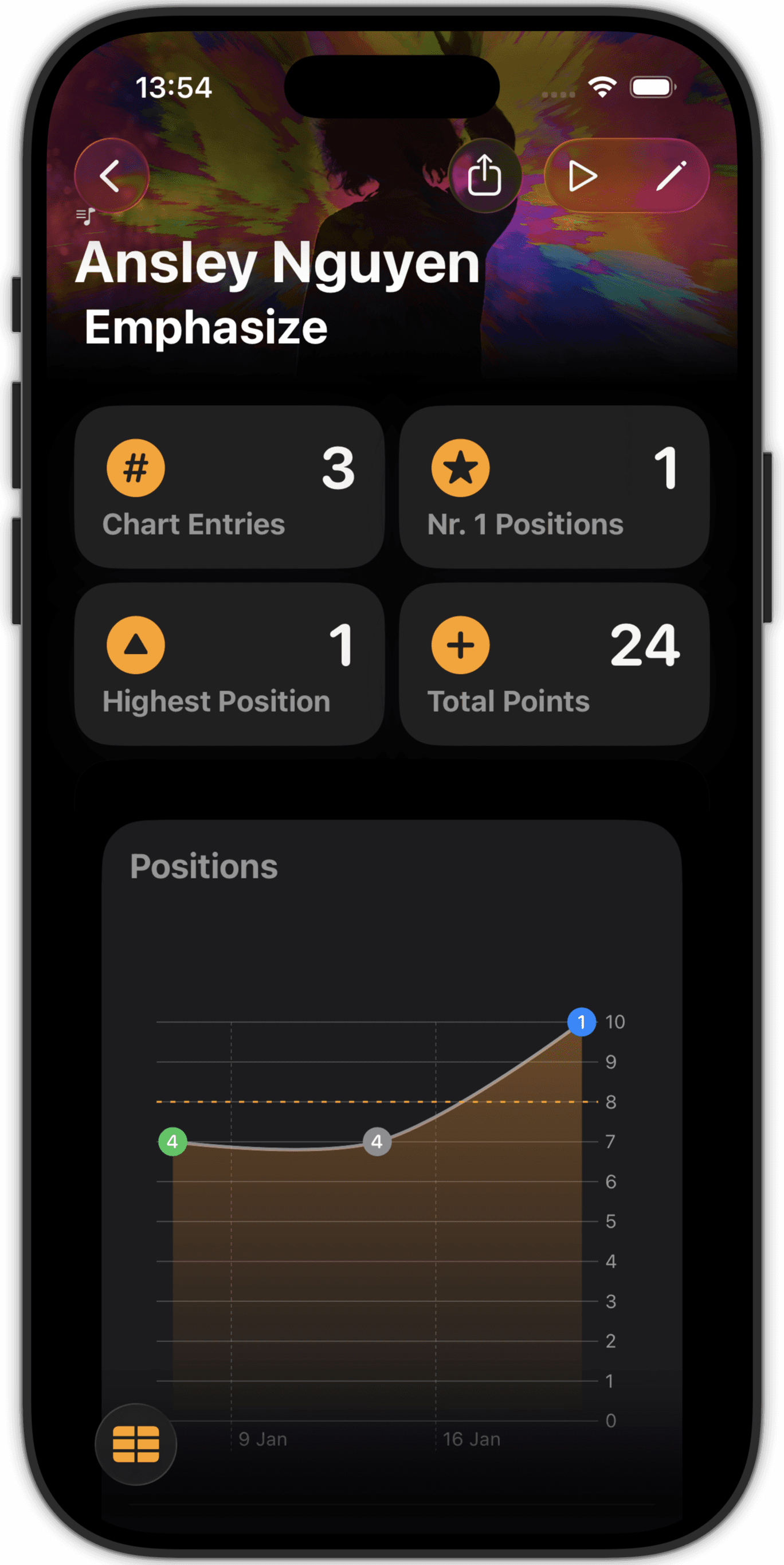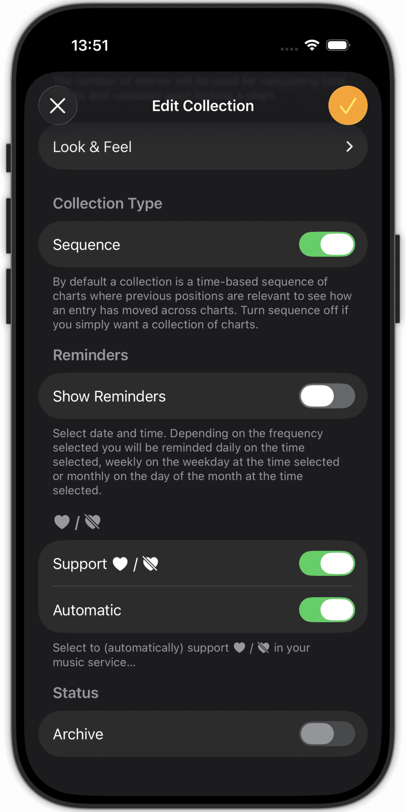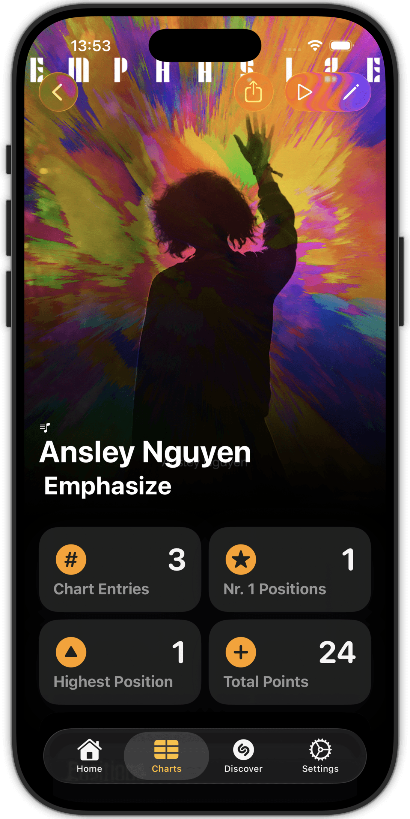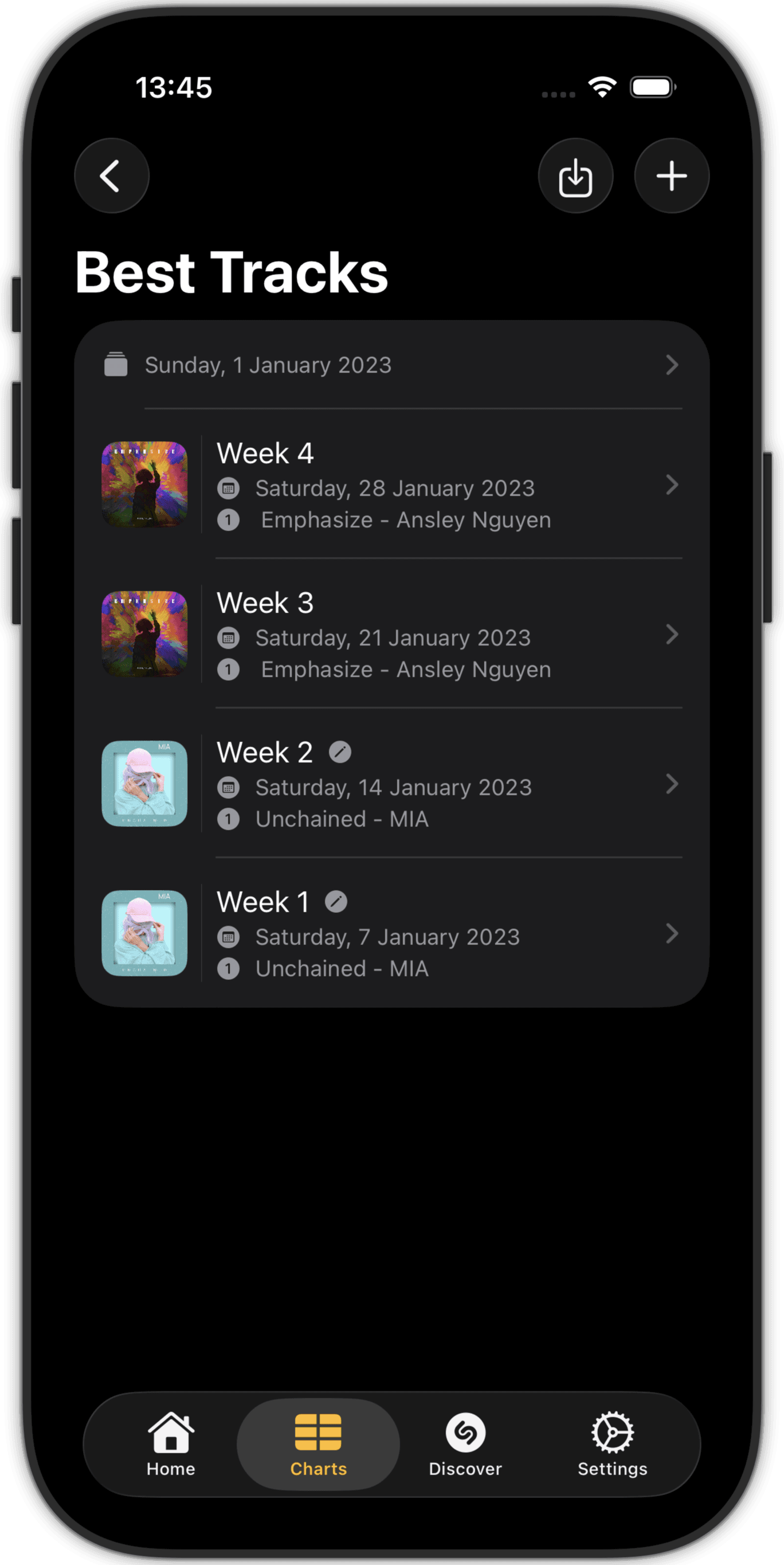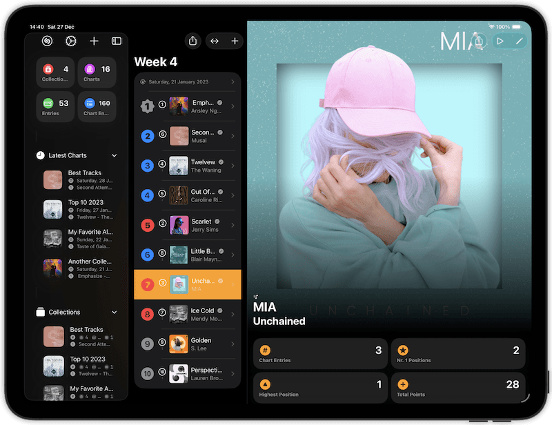 This app is for music lovers that need more than the seasonal 'what did I listen to' lists of Apple Music and Spotify. Be in control of your own charts, not solely determined by (accidental) listening behaviour, but carefully curated by you!